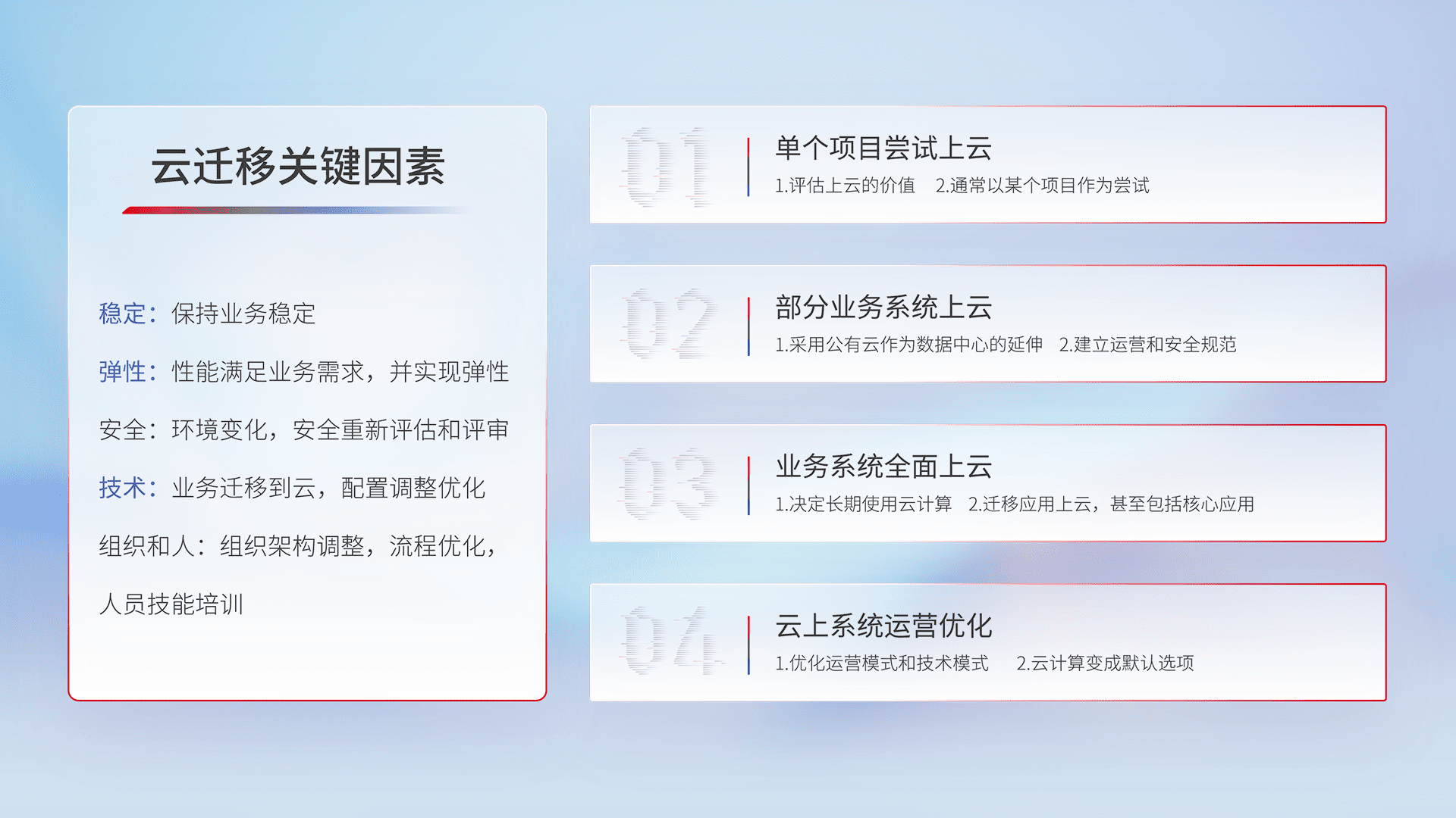 结合实际业务,,,从规划设计、、、云平台选型、、云原生改造、、数据迁移、、集成交付,,迁移全过程为客户识别最佳上云路径,,,做好风险识别管理,,,,设计网络架构、、、身份权限、、、、安全审计合规、、、、操作审计、、日志审计、、、、监控告警策略、、多站点容灾设计等,,,对云上基础设施进行整体规划,,提升IT治理水平,,,,以满足弹性、、、、高可用、、、、高性能的需求。。