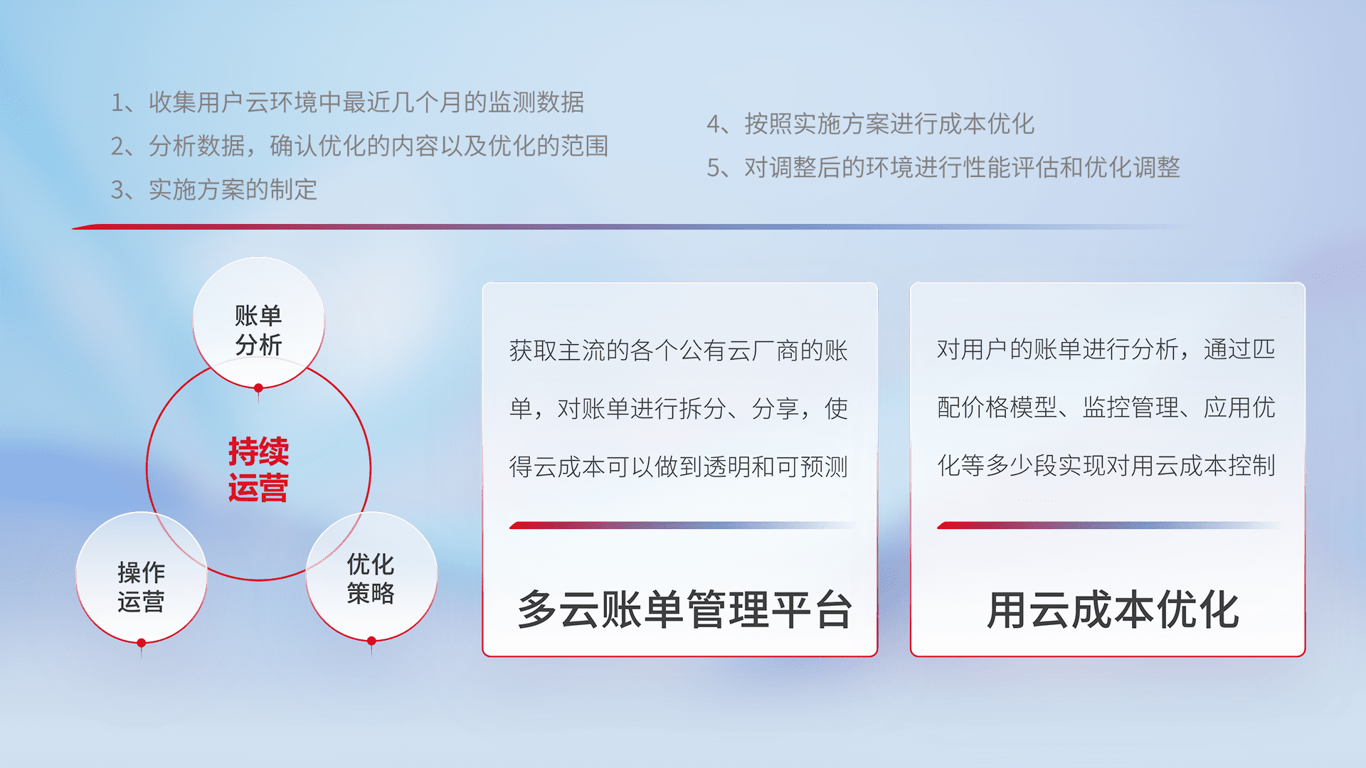 通过多云纳管,,以统一的资源数据模型把客户的云资源进行抽象和封装,,进而实现对多云资源的统一操作,,,保障云资源管理的可靠性、、、稳定性与可用性。。量身定制化运维内容,,,,配置、、、开发运维、、、、补丁管理、、备份、、监控、、、、认证和访问管理、、、审计和日常巡检等,,,保障在用云过程中的可靠度,,,稳定度以及高可用率。。。。
